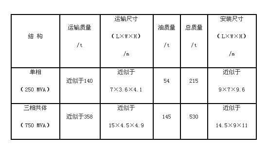 500 kV大型變壓器按鐵心和繞組結(jié)構(gòu)形式可分為單相和三相共體2種形式。以日本東芝公司750 MVA、500/220/35kV自耦有載調(diào)壓強(qiáng)油風(fēng)冷變壓器為例,2種形式變壓器的外形、質(zhì)量比較如表1所示。